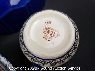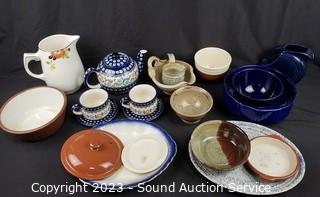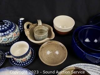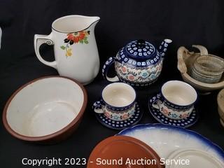 Lot Details: Pitchers, teapot, bowls, etc. Several pieces are Polish Boleslawiec.