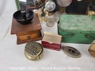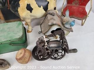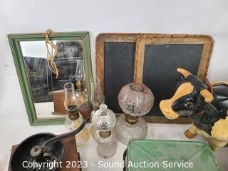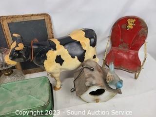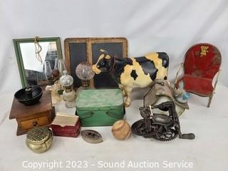 Lot Details: Coffee Mill, oil lamps, tin doll chair, bird house, toy cow, mirror & more.