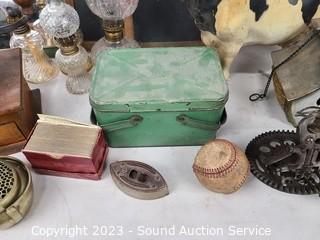 356 Lots including; Antique Tessellated Carved Oak Table, Victorian Sofa, Vintage Maple Beveled Vanity Mirror, Ikea Hesstun King Mattress w/Box Springs, Black Steel Mesh Patio Table w/4 Chairs & Umbrella, File Cabinets, Vtg. Wood Chests, Sound Equipment, Cast Iron Cookware, Uranium Glassware, Colorful/Crystal/Clear Glassware, Milk Glass, Fine China, Pottery, Vtg. Tins, Woven Baskets, Clocks, Antique/Vintage Literature, Assorted Kitchen/Cookware, Assorted Tools/Hardware, Vtg. Holiday Ornaments/Decor, Vtg. Radio Tube Equipment, Household Goods, Rugs & Much More!!!
