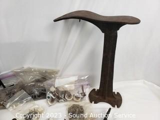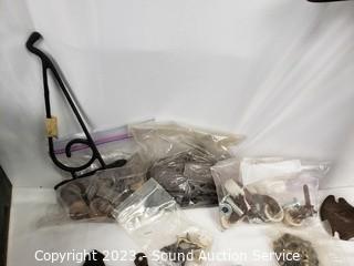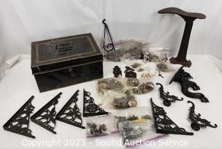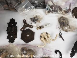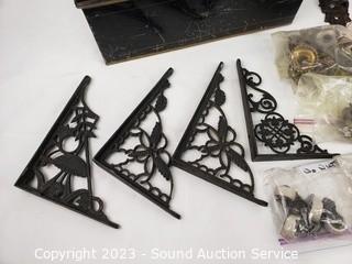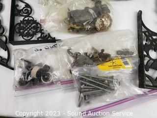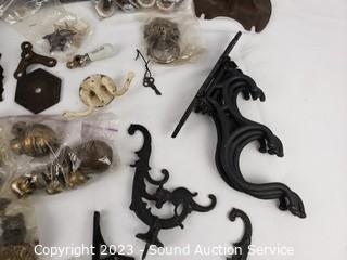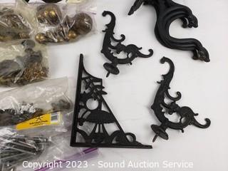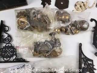 Lot Details: brass knobs/pulls, ceramic caster, cast iron shelf brackets, cast iron pulls, brass pulls/accents & more.