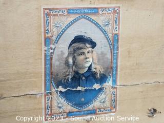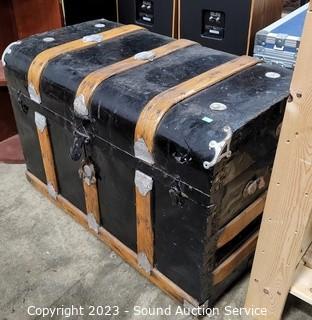 Lot Details: 21.5" x 32" W x 18.5". Various wear from age and use. Missing one of the leather handles.