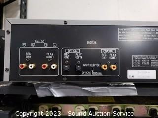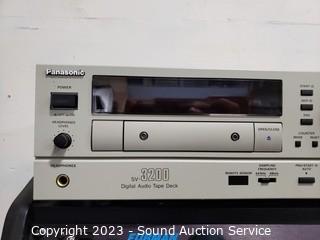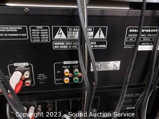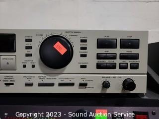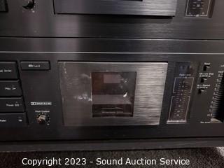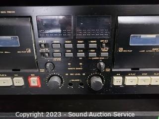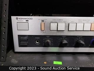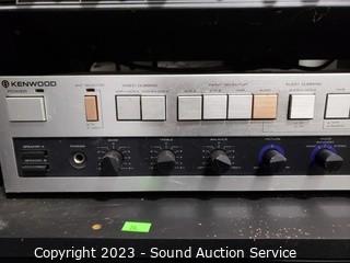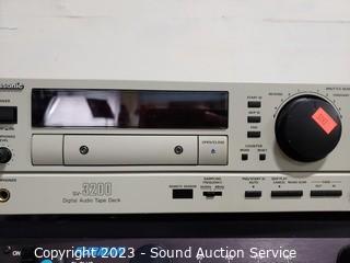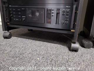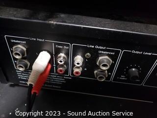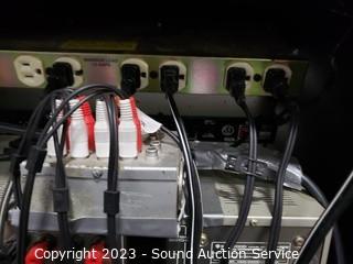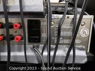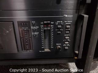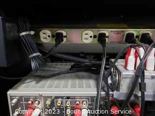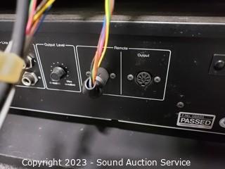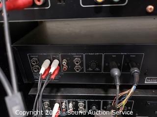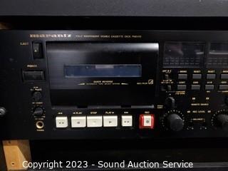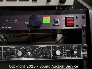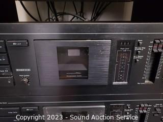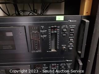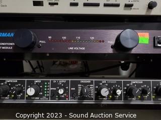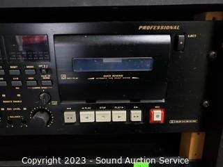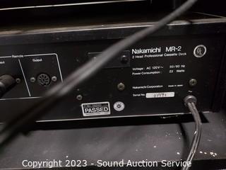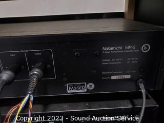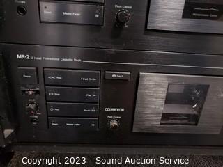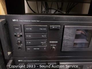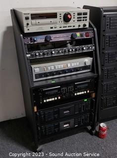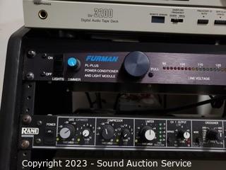 Lot Details: Includes Panasonic SV-3200 digital audio tape deck, Furman PL-Plus power conditioner & light module, Rane DC34 dynamic controller, Kenwood audio video amplifier model KVA-502, Marantz fully independent double cassette deck model PMD510 and 2 Nakamichi MR-2 2-head professional cassette decks. All units have power otherwise untested, one bulb/light on the Furman unit is out. Rack has some wear to the finish, 36" x 20" x 16".