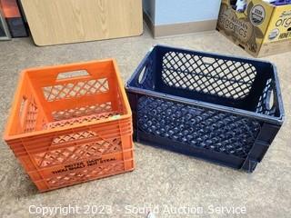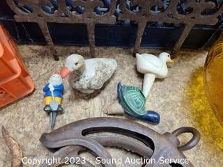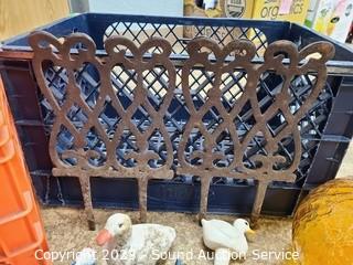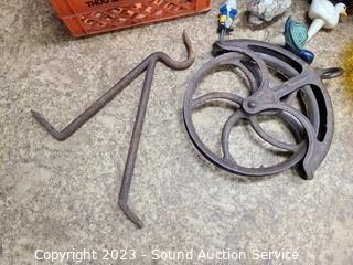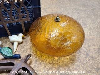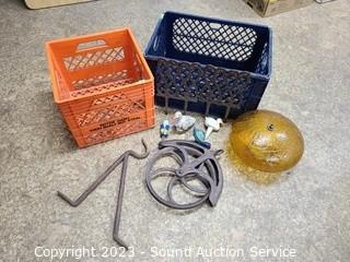 Lot Details: 12" pulley, crackle glass vtg. ceiling light shade 10" Dia, 4" opening. planter pot figures, Cast iron stake decor, 2 milk crates.