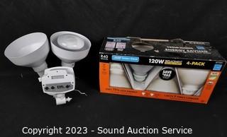 Lot Details: Model E100WSB-C. Like new condition. With 5 Flood light bulbs.