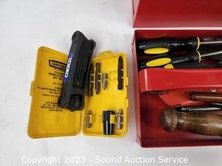 Lot Details: Screwdrivers, drill bits, hex keys, electrical strippers, pliers, metal snips, tape & more. Refer to photos for lot contents.