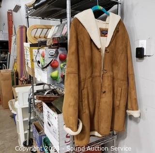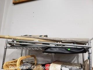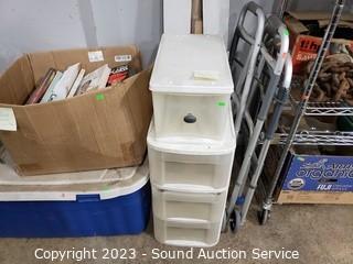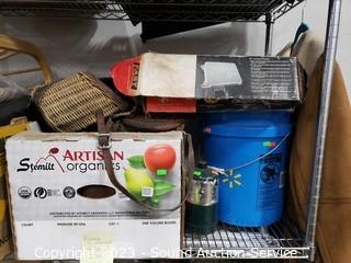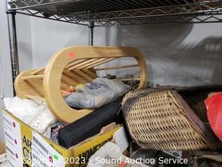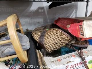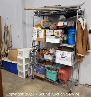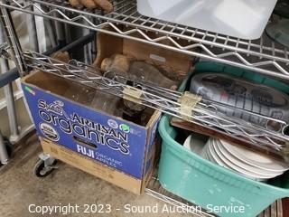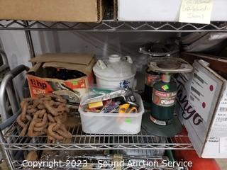 Lot Details: Cart Not included. All are lots or partial lots left behind or not picked up. Rustic boom chain, propane camp stoves, organizers, totes, old wood levels, fishing creel, red steel gas can, clear glassware, dishes, junk drawer items, walkers, old billiard balls, Lands End jacket & much more. Refer to photos for lot contents.