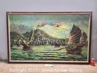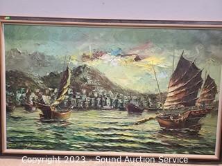 Lot #0021: Large Original Signed Ship Harbor Oil Painting