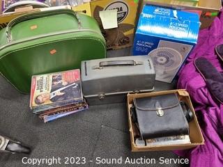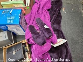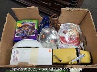 Lot Details: Robe, fan, lunch box, binoculars, household hardware, Pyrex lids, ice crusher, Daniel O'Donnell DVD's, paint spray gun & more. Refer to photos for lot contents.