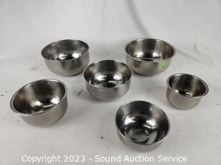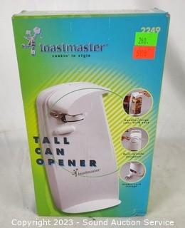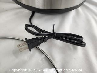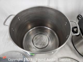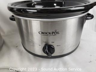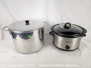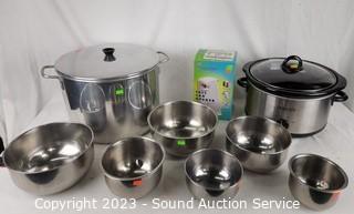 Lot Details: 9.5" x 13" stock pot, 5qt Crock pot (works), Tall elec. can opener (works), 6 stainless bowls 5" to 8.5" dia.