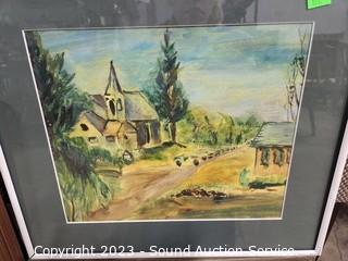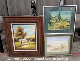 Lot Details: Bremer signed Cottage by Stream Oil Painting, 19" x 22". R. Hicks signed Beach Watercolor, 15" x 12". Church scene painting, don't see a signature, 13" x 15".