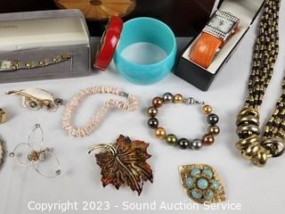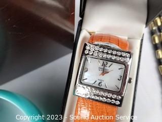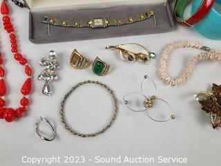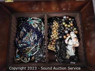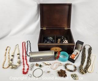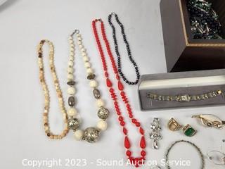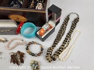 Lot #0112: Marquetry Inlaid Jewelry Box w/Watches & Jewelry