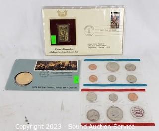 Lot Details: 1971-U.C. US Coin Mint Set, 1984 Crime & Punishment Gold Stamp, 1976 FDI Bicentennial First Day Cover. ATTN: We are not coin or currency experts or graders, please use your own judgement when bidding.