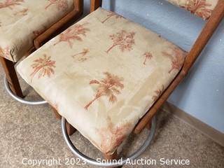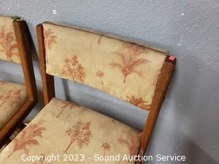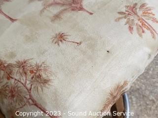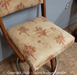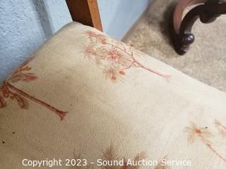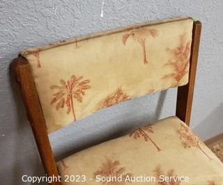 Lot Details: Oak & palm tree print upholstery. Some dirty spots. 36" H x 18" W x 25" to seat.