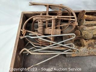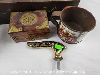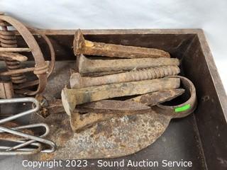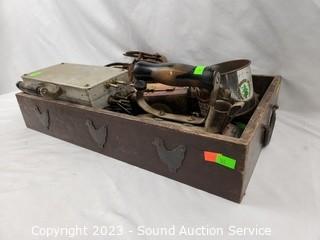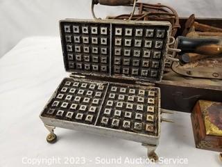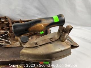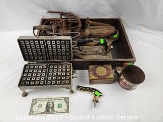 Lot Details: Railroad spikes, Hotpoint Iron, Mole Traps, antique gold tone handle, Waffle Maker, tin cup, trinket box, wood drawer 3" x 11.75" x 18".