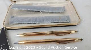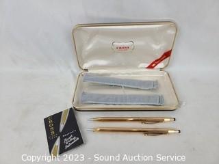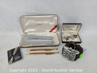 Lot Details: Special Edition Watch, runs for a minute after you shake it to charge but doesn't seem to be holding a charge, Serial W27505G1. Vtg. Anson Gemstone set cufflinks & tie clip. Vtg. Cross 14k Gold Filled Pen & Pencil Set (both work with ink & lead).