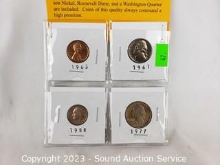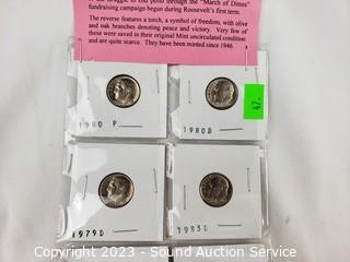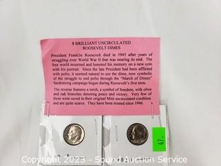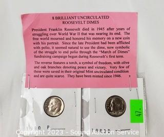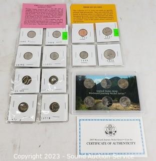 Lot Details: (8) BU Roosevelt Dimes 1977-1980, 1963 to 1988 mixed date proof set, 2005 Westward Journey Nickel Series Mint Set. ATTN: We are not coin or currency experts or graders, please use your own judgement when bidding.