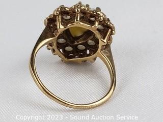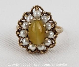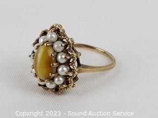 Lot #0210: Vtg. 10k Gold, Pearl & Tigers Eye Stone Ring S:4.5