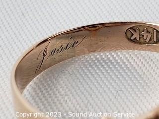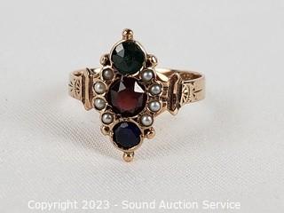 Lot Details: Green stone tested 8 different stones, aquamarine, chrysoprase, demantoid, emerald, jadeite, nephrite, paraiba, peridot. Red stone tested almandine, jadeite, pyrope, rubellite, spessartite. Blue stone tested ruby or sapphire. Engraved "Josie" inside band, also set with small pearls. TW:2.4g.