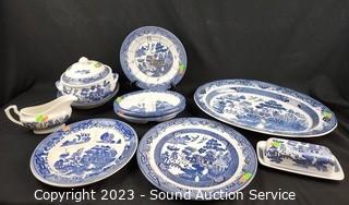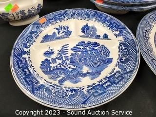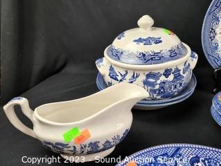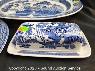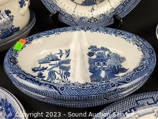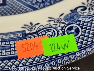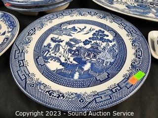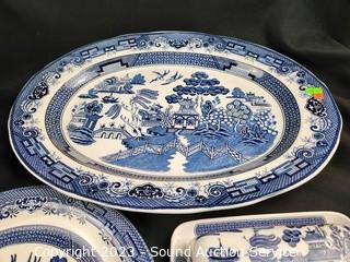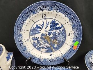 Lot Details: Butter dish, gravy boat, 2 divided dishes, divided plate, charger, clock, (2) 8" serving bowls, 7-1/4" covered server, 18" platter. Don't see any issues