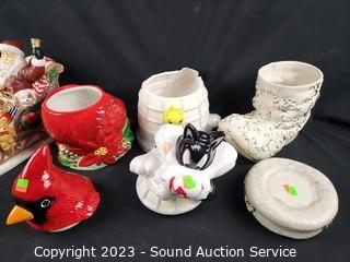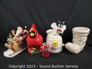 Lot Details: Sylvester & Tweety, Santa, Boot, Cardinal. Boot is Mikasa, Cardinal Sleigh Bell Bistro, Santa is not a cookie jar, just a figure.