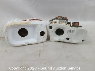 Lot Details: One comes with light, others have no lights. At least one is Norman Rockwell. Approx. 5" to 9" tall. Lighted piece is untested, bulb pushed into hole, has 3 broken pieces.
