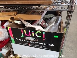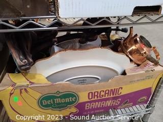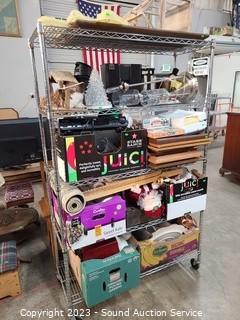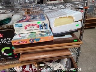 Lot Details: Cart NOT included. Lamp, DVD player, rug, folding chair, artwork, board games, jewelry chest, old clock (parts repair), table & service ware & much more. Refer to photos for lot contents.