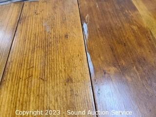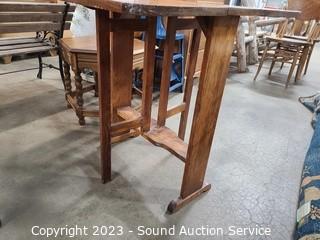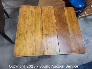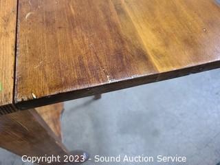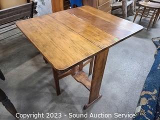 Lot Details: 30" T x 7" x 27" with 12" drop leaves. Some minor wear to the finish, paint residue on one of the leaves. Solid wood construction.