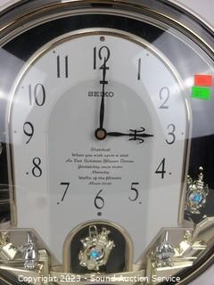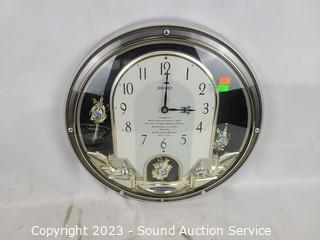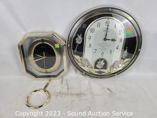 Lot Details: Clocks both working, Seiko side pendulums appear to be working, middle doesn't seem to be working, no chime. Seiko 15" Dia, Roxisal 9.5" x 11".