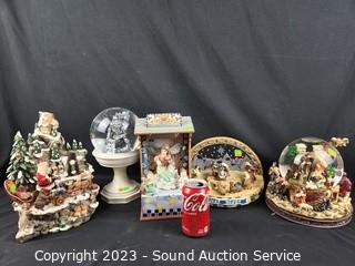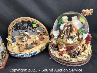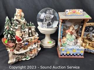 Lot Details: Silent Night is not functioning, white Santa in chimney snow globe (small chip on right side edge where globe sits), baby Jesus snow globe movement, music & lights work (no cover for batteries), Violin angel works, Santa fountain (no pump, sled, deer & rabbit behind it are missing ears).