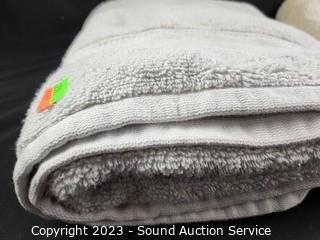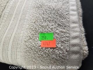 Lot Details: Gray towel has some loose threads, no major issues.