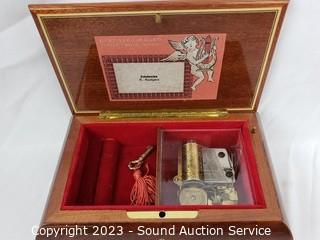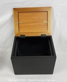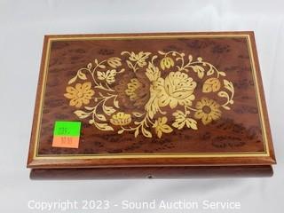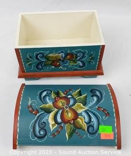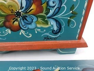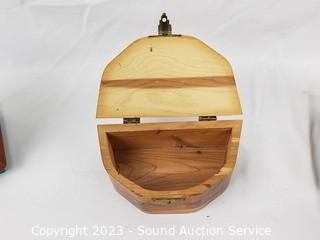 Lot Details: One is Marquetry inlaid, locking with key, velvet lined, 2.5" x 7.5" x 4.5". 1 cedar, 2.25" x 6" x 3.5". 1 signed, hand painted, 5" x 6.5" x 5". Other 6" x 8" x 6".