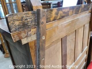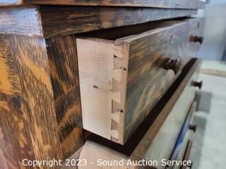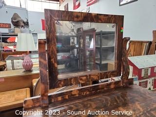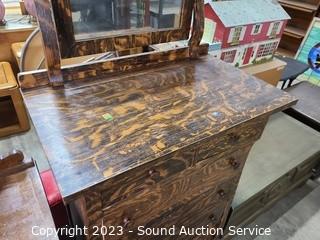 Lot Details: Solid wood construction, dovetail joinery. 48" H x 32" W x 19" D dresser, 21" H x 25" W mirror topper. Some wear to the finish.