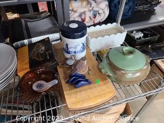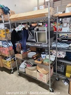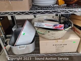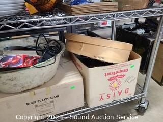 Lot Details: Enamel wear pot, candles, Telex Caramate 4000, Ladies Dress S:6, Lady Susan, various other household goods. Refer to photos for lot contents. Cart NOT included.