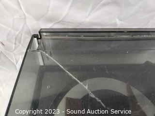 Lot Details: Has power, arm not lowering, needle is responsive. Table took awhile to get up to play speed. Dust cover has some damage.