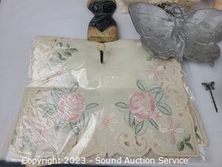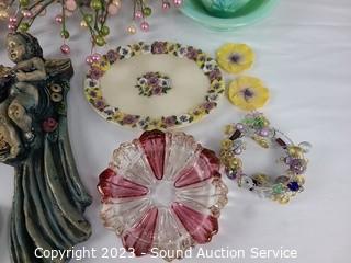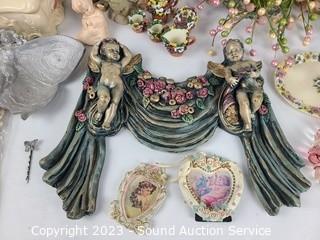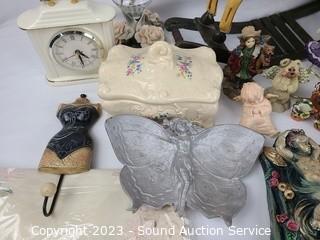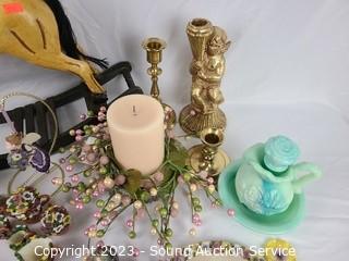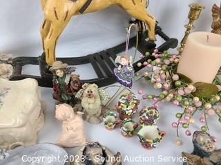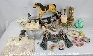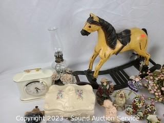 Lot Details: Brass candle holders, ceramic floral arrangement candle holder, quartz clock (works), ceramic trinket box, figures & more. Refer to photos for lot contents. Rocking horse figure has been removed.