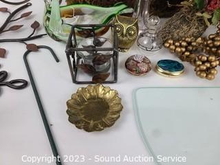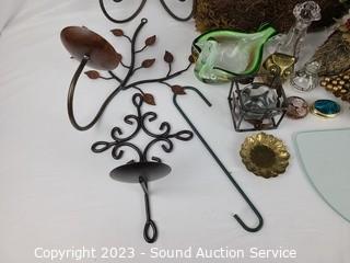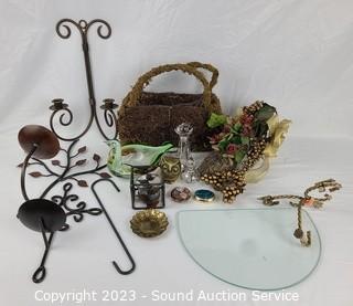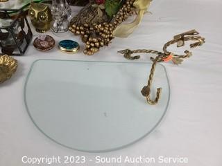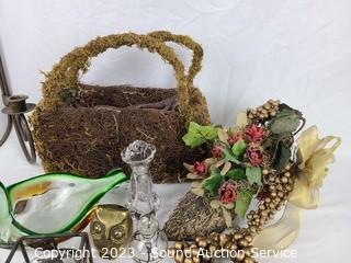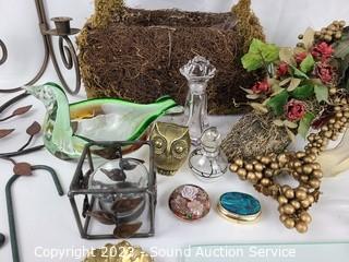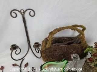 Lot Details: Woven basket, wall mount candle sconce, 2 perfume bottles with stoppers, glass wall mount shelf, decorative shoe w/floral arrangement.