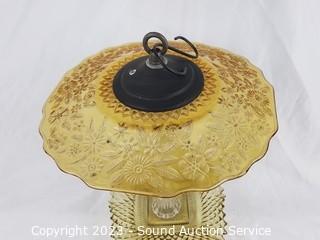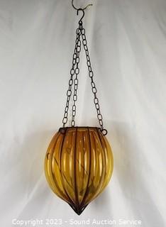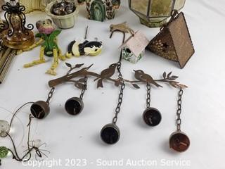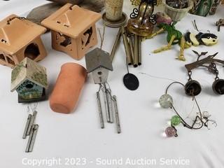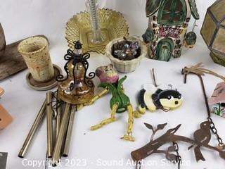 Lot Details: Wind chimes, feeders, figure & other decor. Refer to photos for weathering & wear. Amber globe is cracked. Some weathering & wear.