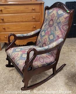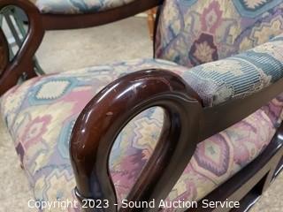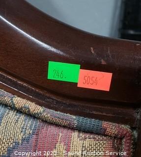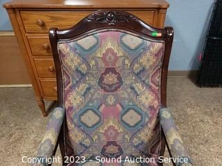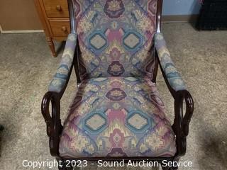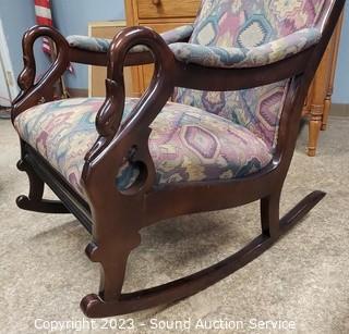 Lot Details: Carved goose head arm rests. 41" H x 24" W x 17" to seat. Some scuffs and wear to wood finish.