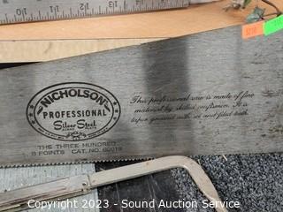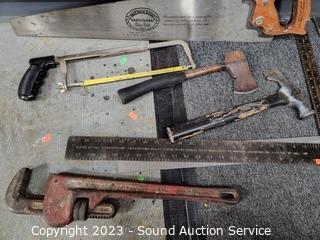 Lot Details: Spring clamps, hatchet, crosscut saw, hammer, wrenches, screwdrivers, carpenters square & more.