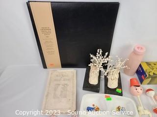 Lot Details: Winnie the Pooh heated dish (no power supply), bottle, toys, photo albums, crocheted booties.