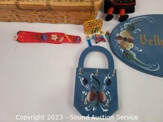 Lot Details: 12.5" x 10.5" needlepoint, hand painted in Norway Welcome sign and key hook, woven fan decor and more.
