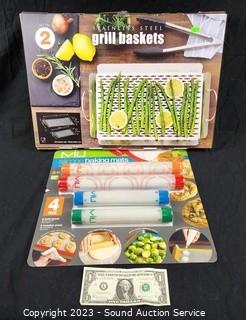 Lot Details: Baking Mats (2) 11.6" x 16.5" & (2) 11.6" x 8.1" have been opened, don't see any issues. Grill baskets 10" x 13.8" & 10.9" x 17.7", factory sealed.