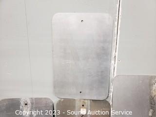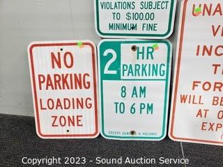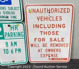 Lot Details: "Reserved Parking", "No Parking, Loading Zone", "2HR Parking 8AM to 6PM" 12" x 18" & "Unauthorized Vehicles will be Removed at Owners Expense" 24" x 18". Some weathering, wear, bends.