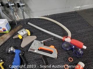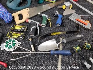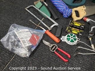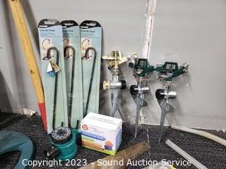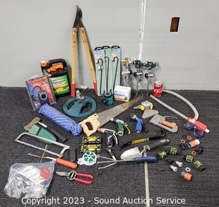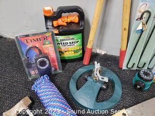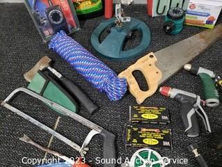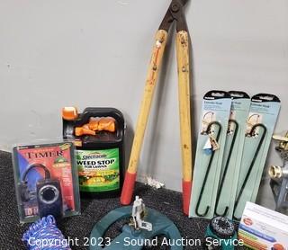 Lot Details: Sprinklers, loppers, crosscut saw, spray nozzles, plant hanger hooks, weed killer, 100ft nylon rope, hand pump & more.