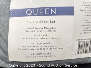 Lot Details: Gray Herringbone print. 1 flat, 1 fitted, 4 pillow cases.