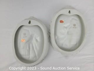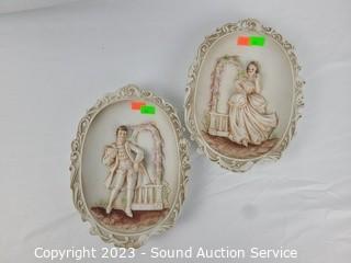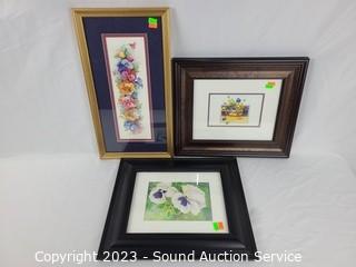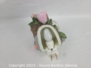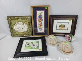Lot Details: 2 Lefton porcelain wall decor 8.5" x 6". 1 is chipped. Porcelain floral night light, works. Floral artwork, 12" x 14", 9" x 17", 12" x 14", some cosmetic wear on frames.