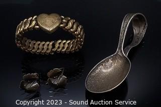 Lot #0036: Vtg. Sterling Bracelet, Earrings & Bent Spoon