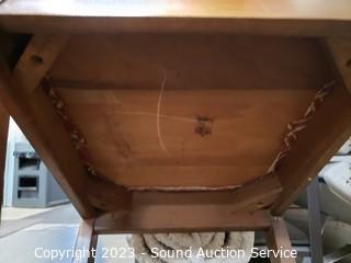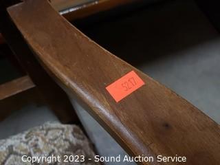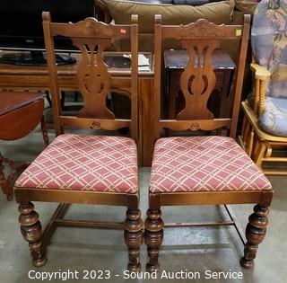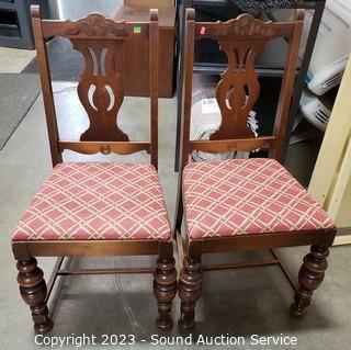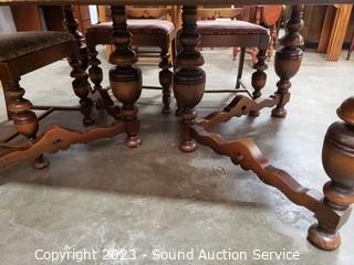 Lot Details: Various wear to finish, scuffs, scratches, etc. Turned legs, splat back. 2 chairs have different upholstery. 30" H x 46" x 56" with (3) 9" leaves.