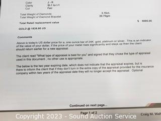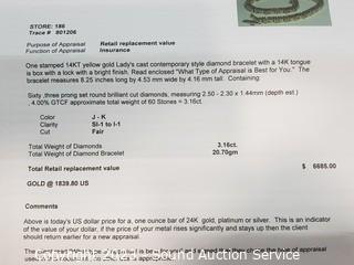 Lot Details: Comes with detailed appraisal with gold valued at $1839, appraised to be $6,685. Approx. 60 Round brilliant cut diamonds, color:J-K, Clarity SI-1 to I-1, TW of diamonds 3.16ct, TW of bracelet 20.7g. Refer to photos for complete appraisal details. 8.25" L