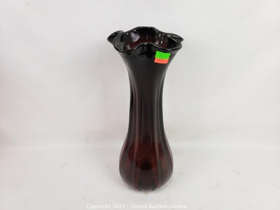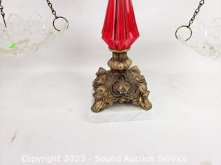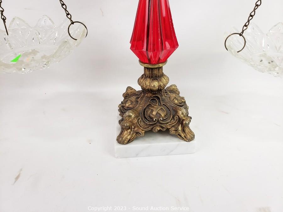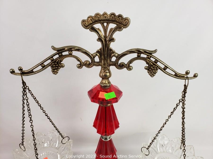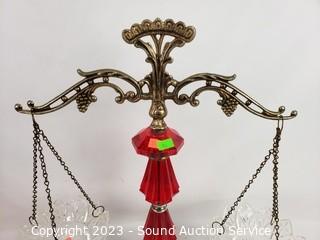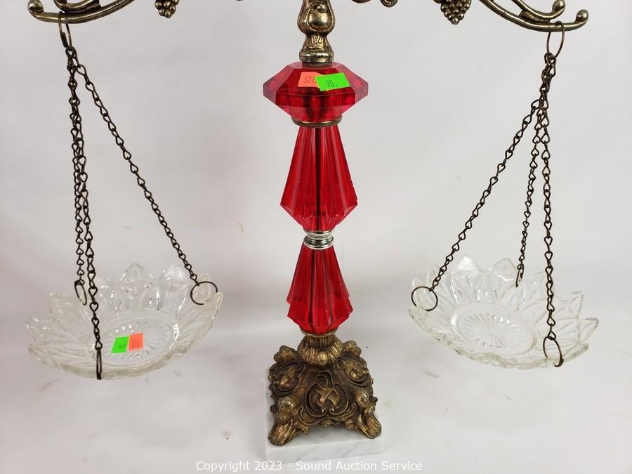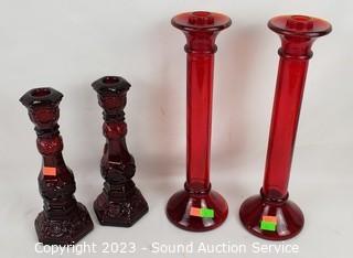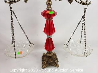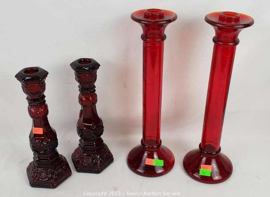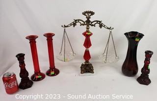 Lot #0090: Ruby Glass Ware Candleholder, Vases, Scale Decor